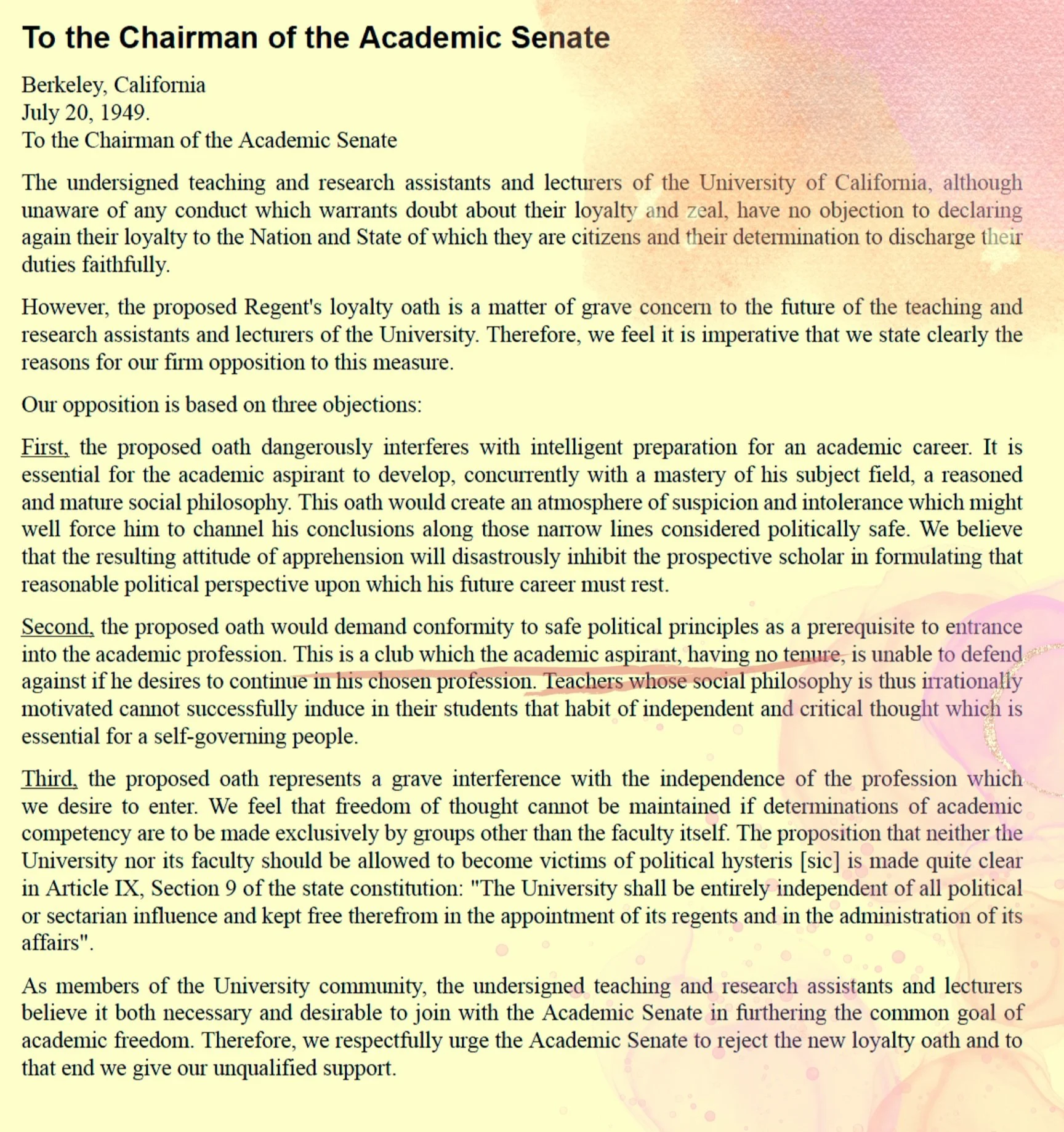 Half of the faculty had signed by the end of August 1949. The letter above was written by non-Senate academic employees, teaching and research assistants and lecturers, in July 1949. They framed their concerns about how the oath would undermine academic freedom both as members of the academic community at the university and as untenured and precarious academics who would have to conform to “safe political principles” in order to enter the profession.
