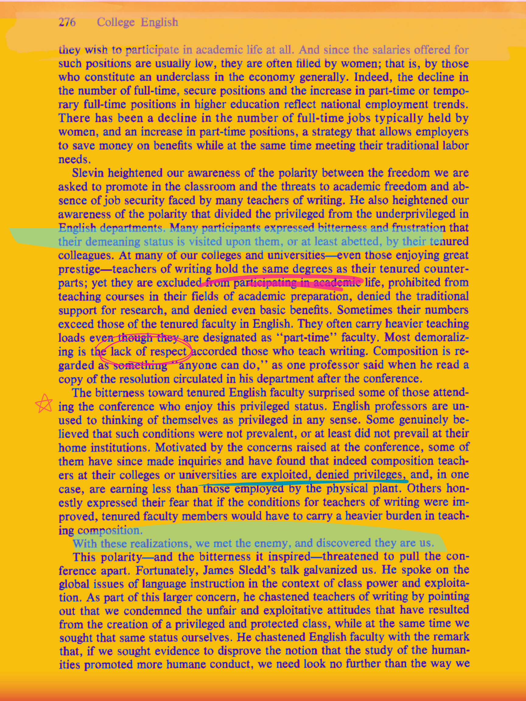 Some of us were struck with the irony that those of us charged with this significant responsibility [enabling students to discover the freedom of self-expression] often feel unable to speak freely about the fundamentally unfair conditions under which we labor.