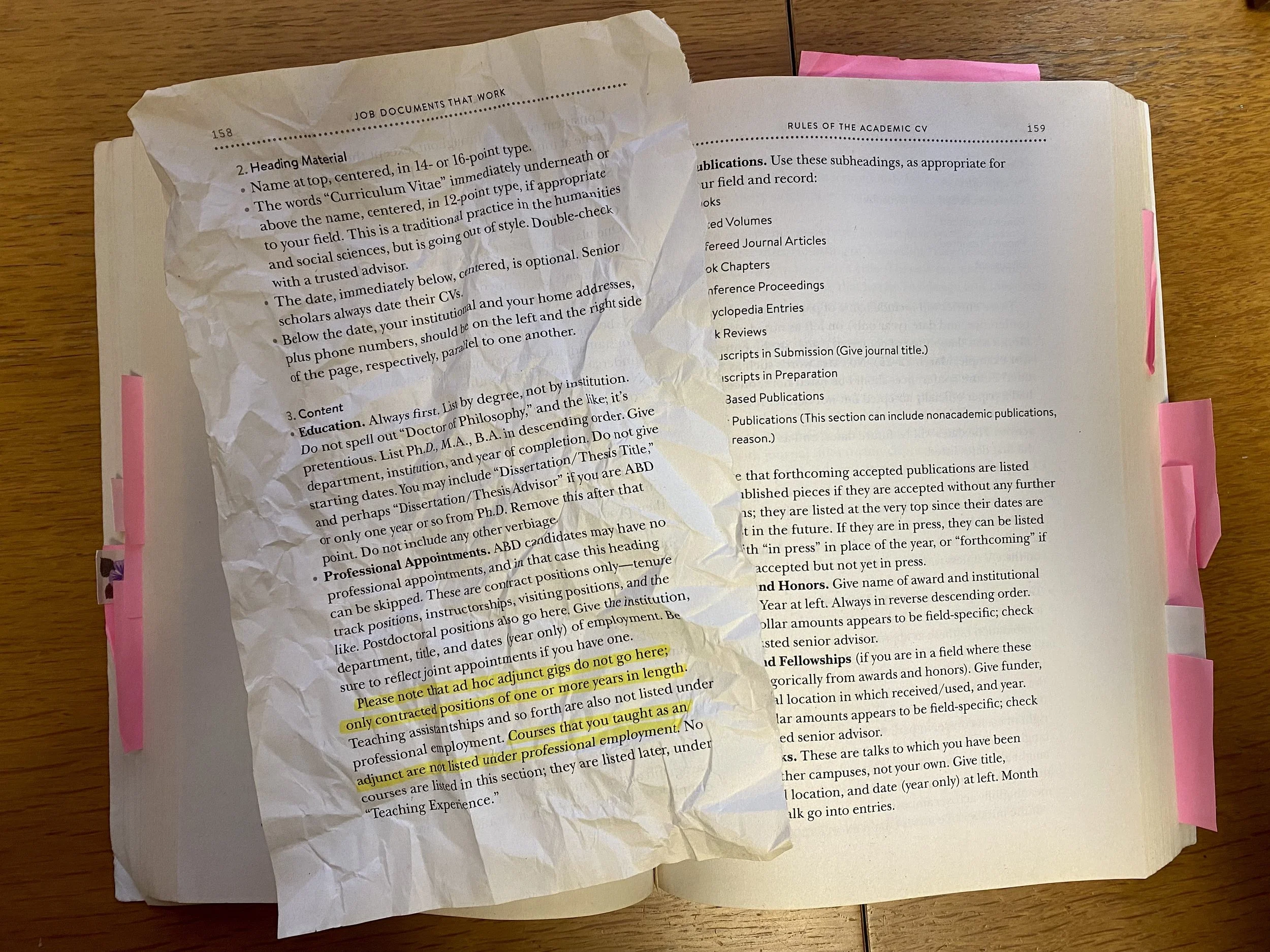 This standard guidance and advice for graduate students and new PhDs encapsulates the way academia devalues adjuncts’ labor as teachers, but also removes our positions (“ad hoc gigs”) from other positions of higher value and status.