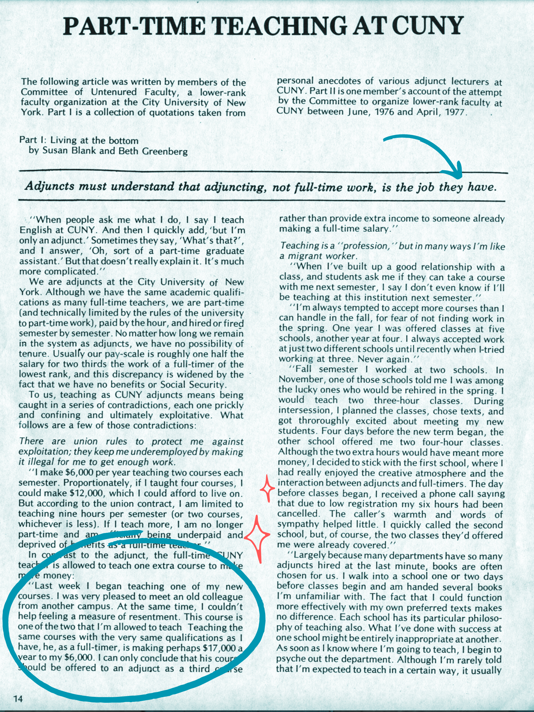 Blank and Greenberg’s article compiled quotes from CUNY adjuncts from 1976, which continue to encapsulate the adjunct experience, including pay inequity between tenure-line and adjunct faculty, the labor involved in securing enough classes to teach each term, and the lack of opportunity for community building on campus.